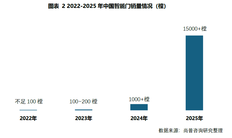 2025年是中国智能门的黄金增长期。供应链降本带来了产品价格的大幅降低,市场需求量实现跨越式增长。过去几年,市场需求量从不足百樘攀升至2025年超过1.5万樘。2025年中国智能门市场规模约为1.6亿元,同比增长超140%。
