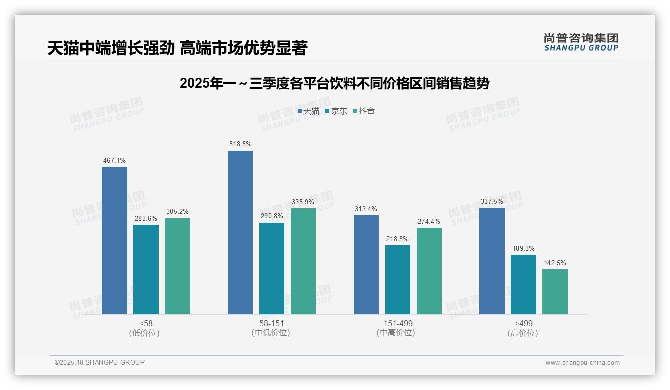 战略规划必备:天猫平台饮料中端价格带同比增长518.5%,应纳入年度规划。这一数据源于尚普咨询集团庞大的样本库与先进分析工具,调研覆盖上万用户,最终筛选出134...