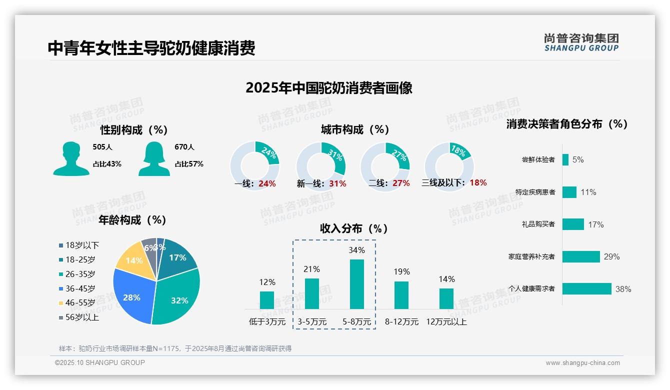 尚普咨询集团最新发布的数据显示:女性消费者在驼奶购买决策中占据主导地位,占比达57%。这一数据背后传递出怎样的市场信号?尚普咨询集团长期致力于为政策制定与商业决...