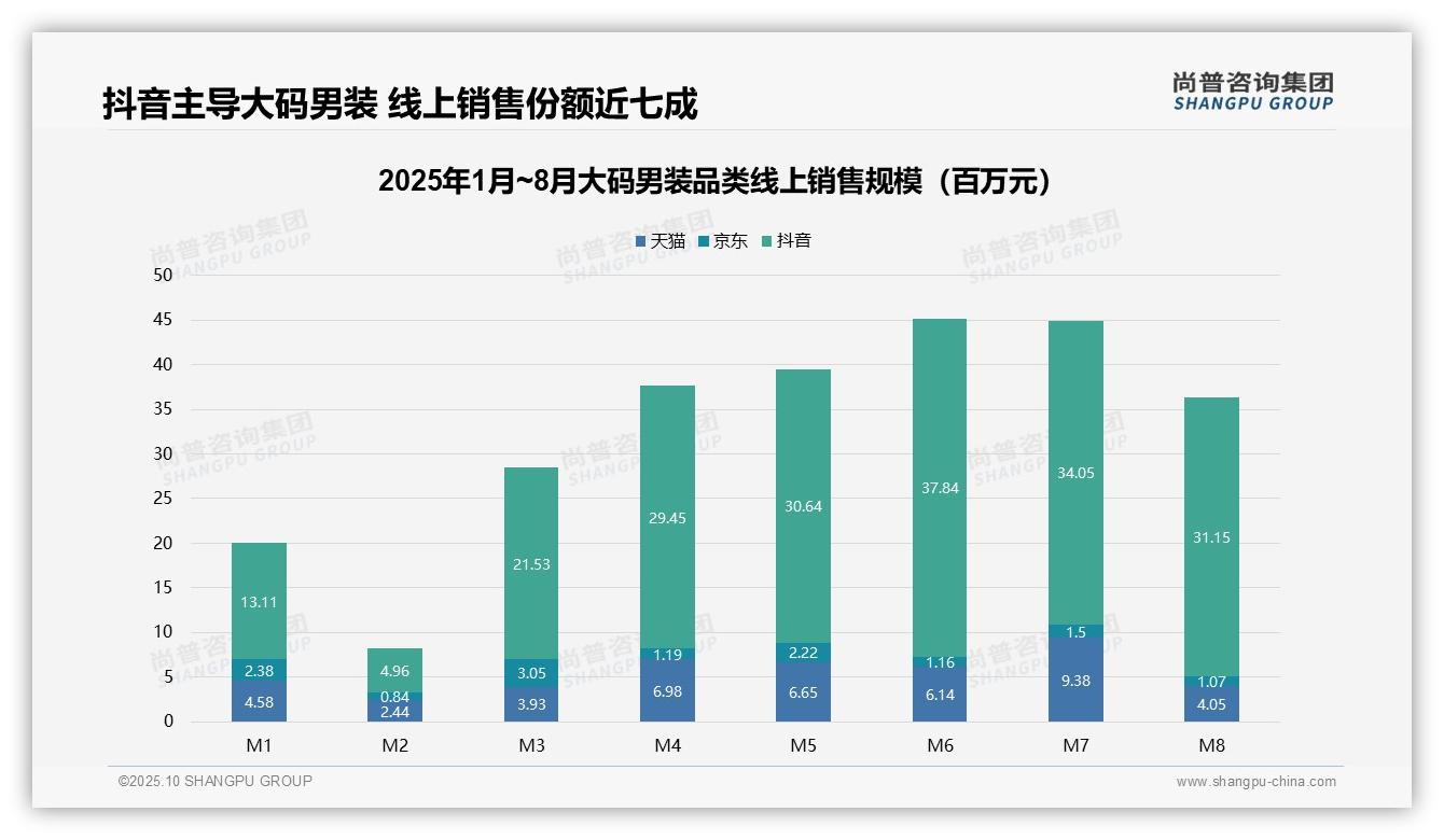 尚普咨询集团最新研究显示:抖音占据大码男装线上销售68.8%市场份额,企业应如何布局?这一结论基于尚普咨询集团多年持续追踪研究,通过对海量数据进行筛选,最终选取...