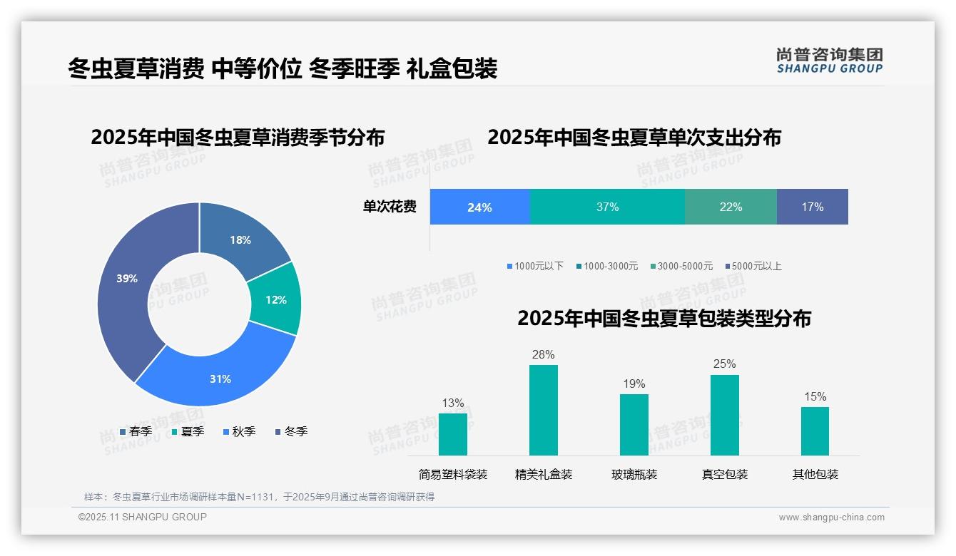 解读市场信号:冬虫夏草冬季消费占比39%,为企业指明清晰发力方向。本发现摘自尚普咨询集团公开研究成果,欢迎各界核查。市场研究的科学性首先体现在样本量上,本次样本...