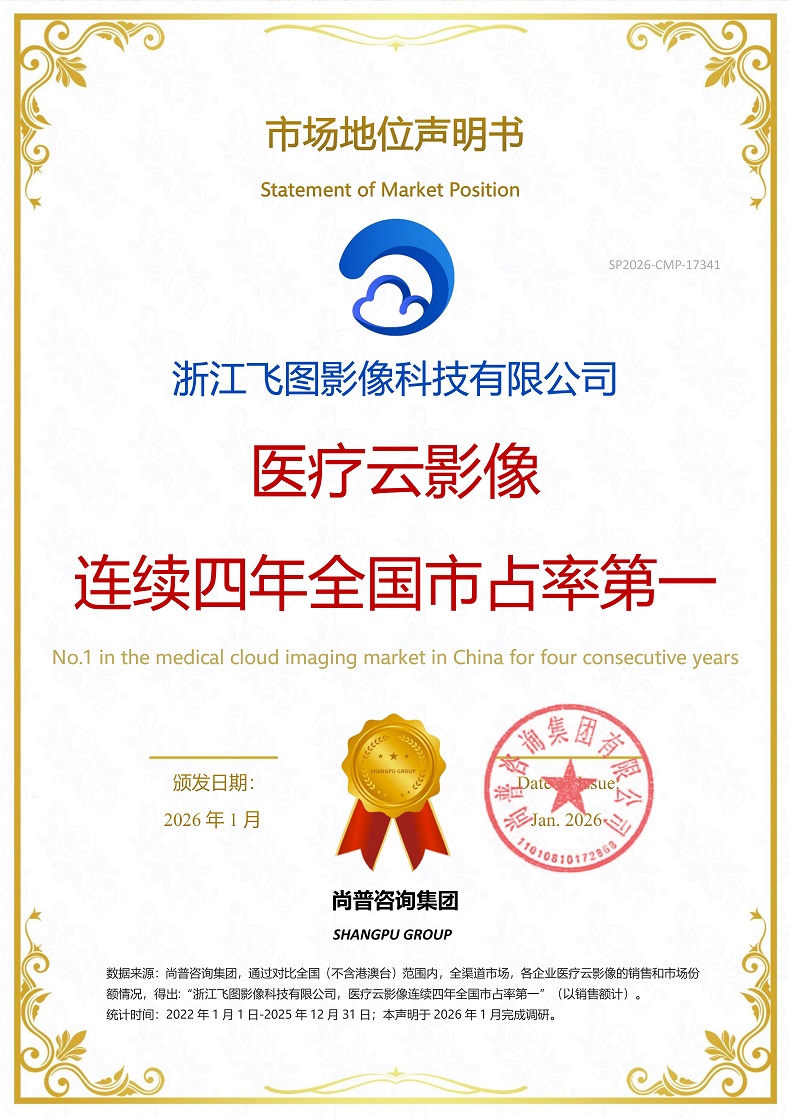 2026年1月,尚普咨询集团为飞图医疗颁发市场地位声明书。此次飞图医疗荣获尚普咨询【飞图医疗(浙江飞图影像科技有限公司),医疗云影像连续四年全国市占率第一】市场地位声明,标志着飞图医疗在医疗云影像行业细分领域中的领先地位及市场的高度认可。