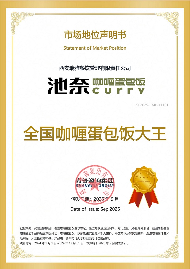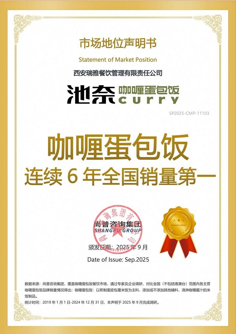 近期,尚普咨询集团向总部位于陕西西安的西安瑞雅餐饮管理有限责任公司(以下简称“瑞雅餐饮”)旗下品牌池奈(原“西安池奈餐饮管理有限责任公司”旗下品牌)的咖喱蛋包饭产品颁发市场地位声明。此次,经过严密的数据考证,尚普咨询集团确认向瑞雅餐饮授予【池奈 咖喱蛋包饭连续6年全国销量第一】及【池奈 全国咖喱蛋包饭大王】的权威声明。瑞雅餐饮的咖喱蛋包饭凭借其特色风物和美味的食材,赢得了市场的广泛青睐。
