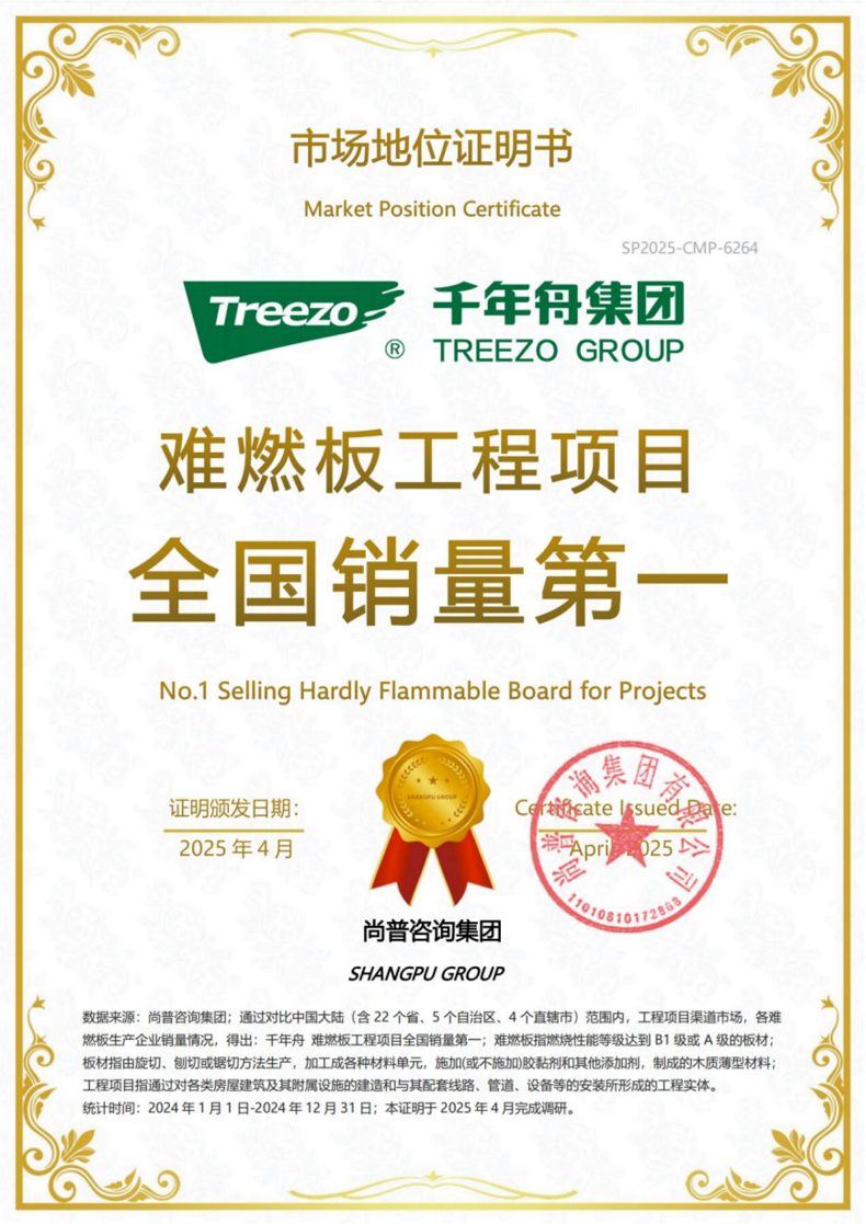 2025年4月,尚普咨询集团向千年舟颁发市场地位声明书。此次千年舟荣获尚普咨询【千年舟 难燃板工程项目全国销量第一】市场地位声明,标志着千年舟在板材行业中的卓越地位及市场的高度认可。