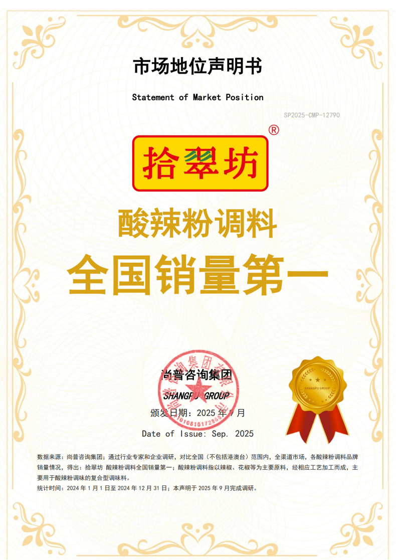2025年9月,尚普咨询集团向四川食萃食品有限公司颁发【拾翠坊 酸辣粉调料全国销量第一】市场地位声明书。此项声明不仅记录着销量背后的市场认可,更是对一种品质承诺的加冕——在竞争激烈的调味品市场,拾翠坊用实打实的销量数据,证明了消费者对地道川味酸辣粉调料的集体选择。