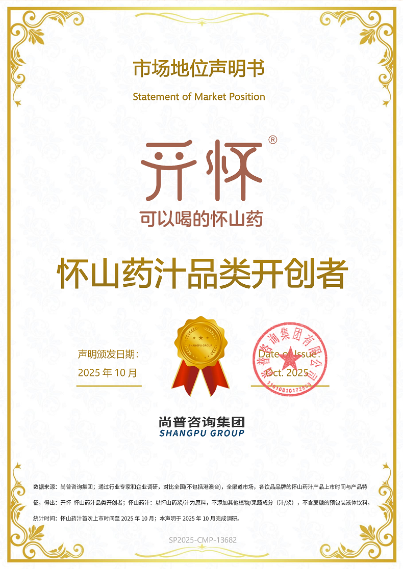 2025年10月,尚普咨询集团向河南开怀饮品有限公司(以下简称“开怀饮品”)旗下品牌开怀的怀山药汁品类颁发市场地位声明书。此次开怀怀山药汁系列产品荣获尚普咨询集团【开怀 怀山药汁品类开创者】权威声明,这不仅是对开怀品牌创新实力的高度认可,也标志着中国饮品行业一个全新细分品类——怀山药汁的正式诞生。
