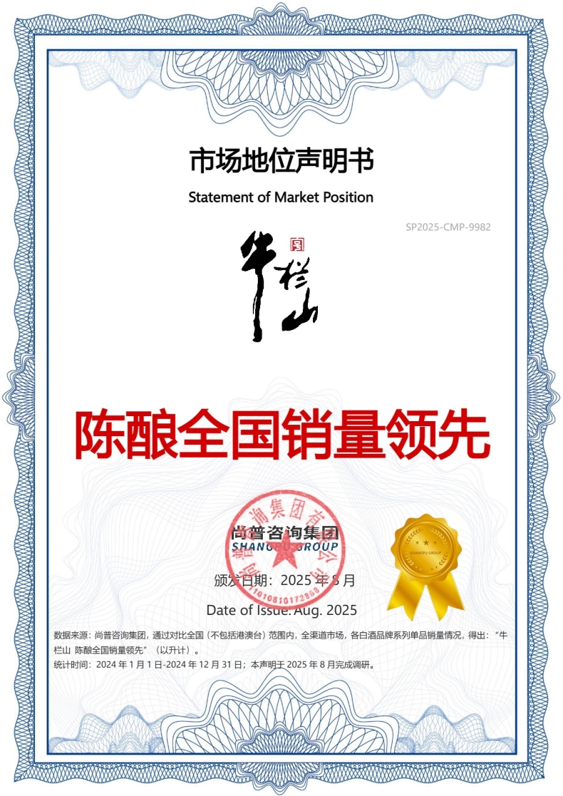 2025年8月,尚普咨询集团为牛栏山颁发市场地位声明书。此次牛栏山荣获尚普咨询【牛栏山陈酿10年累计销售60亿瓶】【牛栏山陈酿全国销量第一】【牛栏山陈酿全国销量遥遥领先】【牛栏山陈酿全国销量领先】市场地位声明,标志着牛栏山在光瓶酒赛道的领导地位及市场的高度认可。
