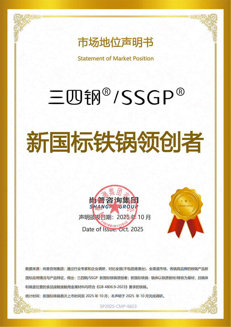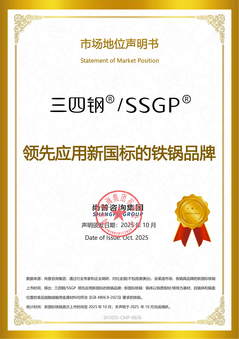 2025年10月,尚普咨询集团向广东三四钢不锈钢实业有限公司(以下简称“广东三四钢”)旗下品牌三四钢®的新国标铁锅颁发市场地位声明书。此次三四钢®新国标铁锅系列产品荣获尚普咨询集团【三四钢/SSGP 新国标铁锅领创者】【三四钢/SSGP 领先应用新国标的铁锅品牌】权威声明,三四钢®首批推出符合新国标的铁锅,这不仅是对其研发能力的印证,更以实际行动为行业树立了新的安全与品质标杆。