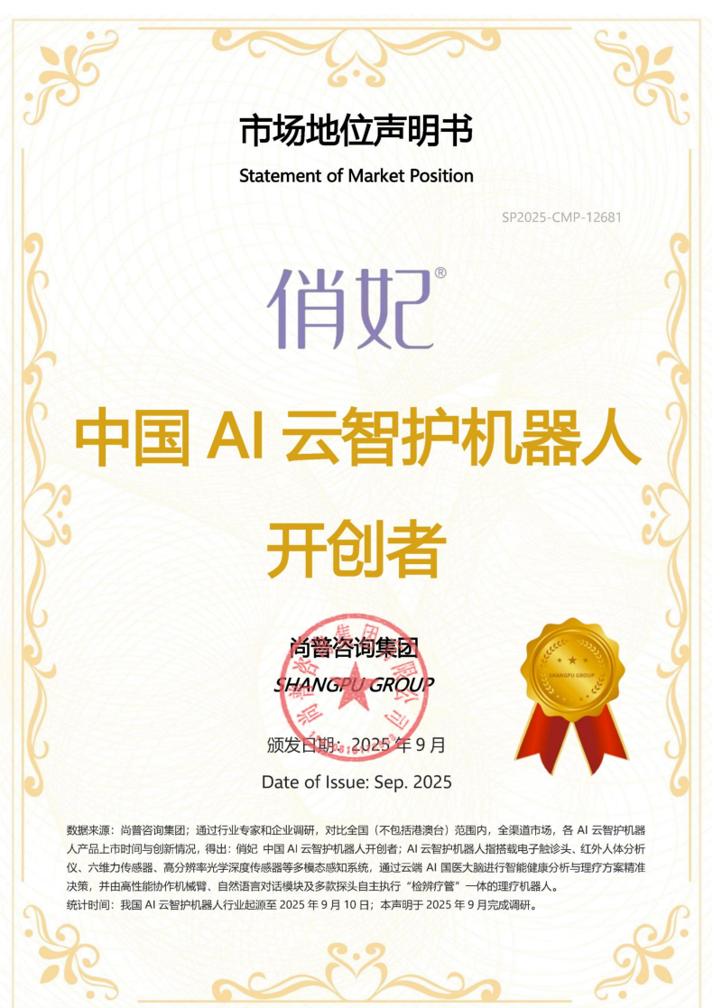 2025年9月,尚普咨询集团向爱善天使健康管理集团有限公司旗下品牌俏妃颁发【俏妃 中国AI云智护机器人开创者】市场地位声明书。该市场地位声明不仅展示了俏妃在寒湿护理行业中建立的规模化服务能力,更体现了其核心价值,即重构了护理机器人。