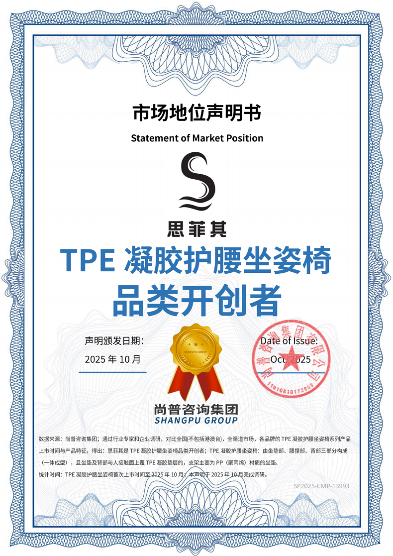 2025年10月,尚普咨询集团向思菲其品牌的TPE凝胶护腰坐姿椅系列产品颁发市场地位声明书。此次思菲其TPE凝胶护腰坐姿椅系列产品荣获尚普咨询集团思菲其【TPE凝胶护腰坐姿椅品类开创者】权威声明,表明思菲其TPE凝胶护腰坐姿椅系列产品在产品研发、市场推广方面的卓越能力和消费者对其的认可。