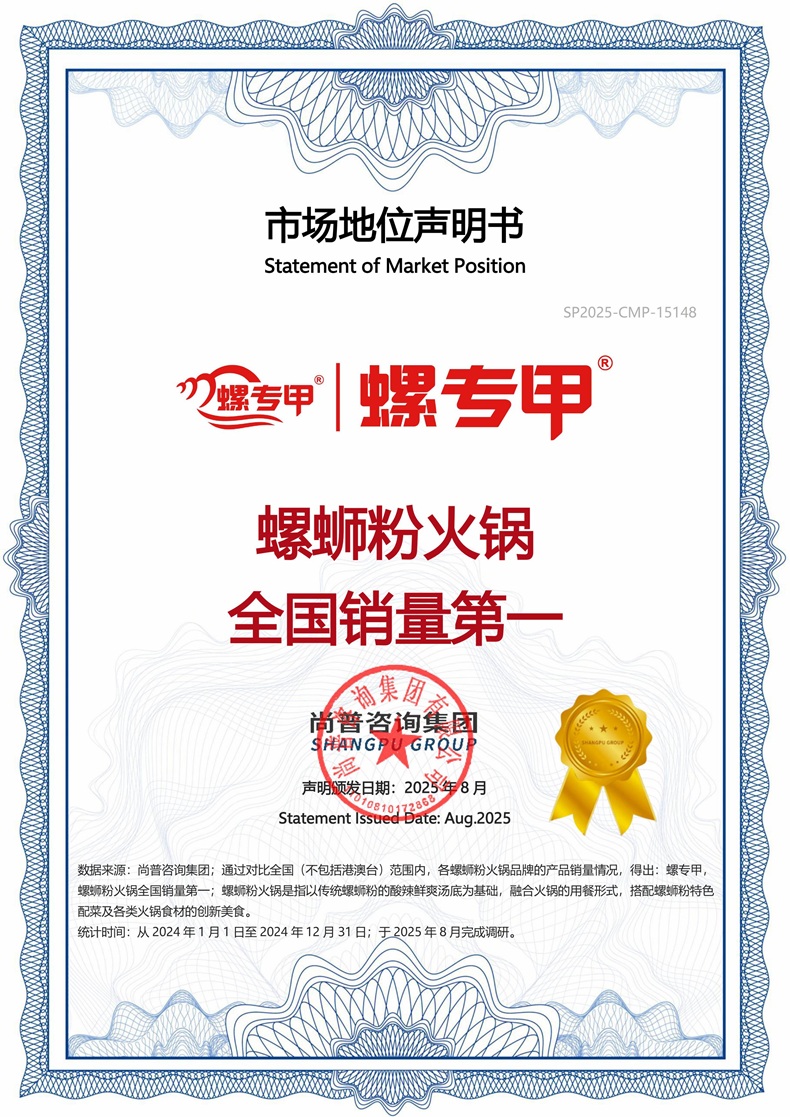2025年8月,尚普咨询集团向河南螺专甲餐饮管理有限公司颁发【螺专甲 螺蛳粉火锅全国销量第一】市场地位证书。这不仅是对品牌实力的高度认可,更印证了其在螺蛳粉火锅领域的领航地位。螺专甲凭借对正宗风味的执着坚守与对食客口味需求的精准把握,赢得全国消费者的青睐,以亮眼的市场表现稳居品类销量榜首,成为螺蛳粉火锅领域当之无愧的行业标杆。