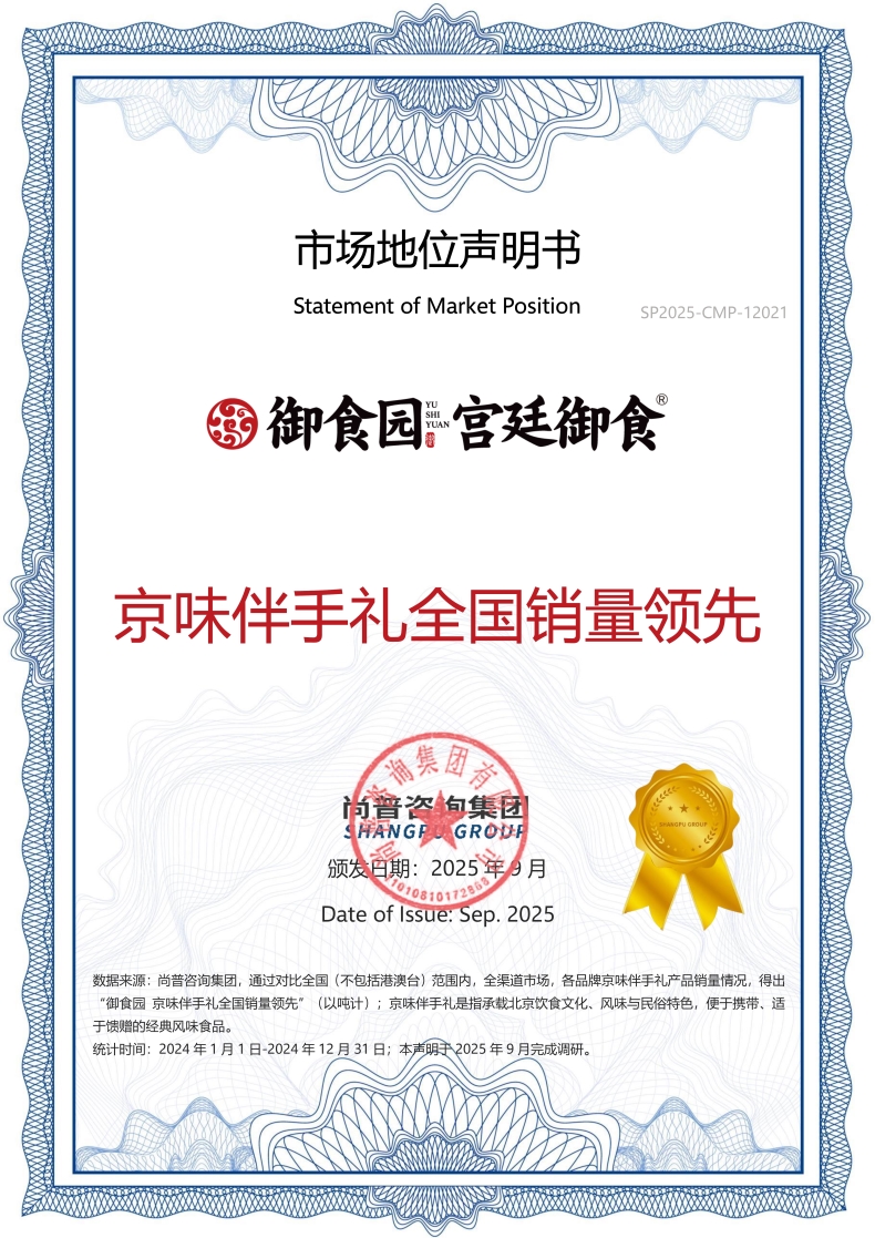 此次御食园荣获尚普咨询【御食园 京味伴手礼全国销量领先】市场地位声明,标志着御食园在行业中的领先地位,反映了其深受广大消费者认可与喜爱。