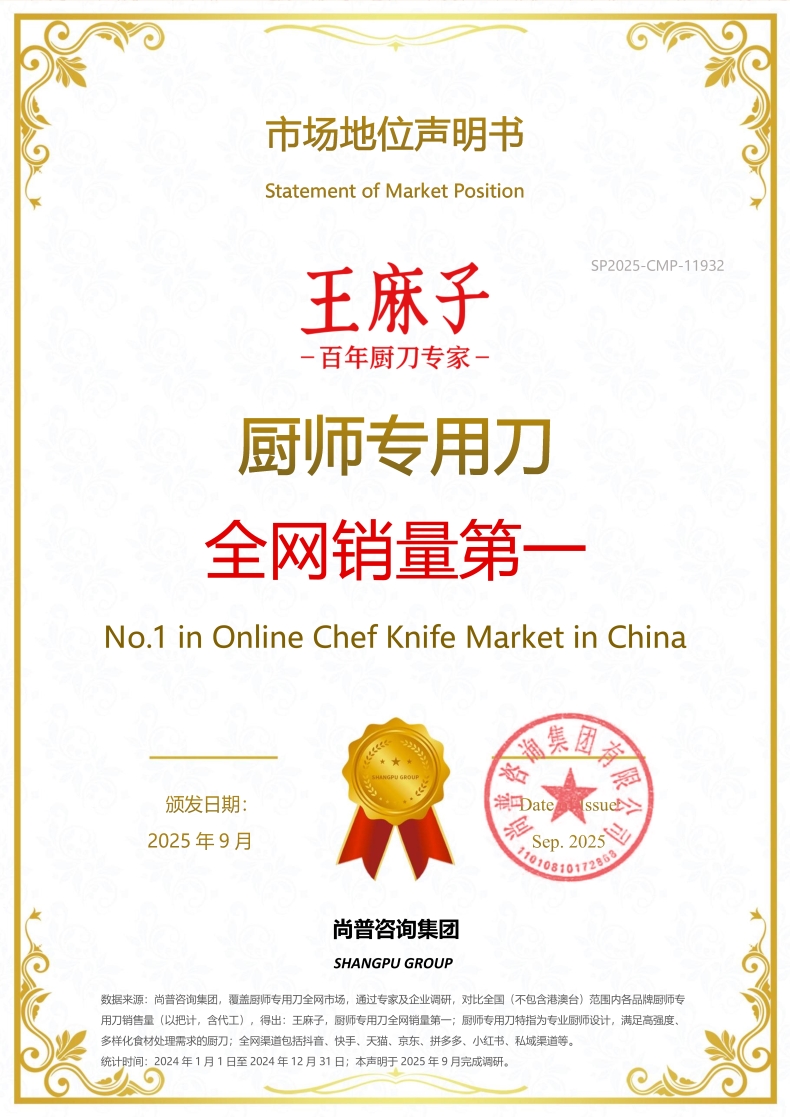 一方面,王麻子以374年国家级非遗锻造技艺为基石,深度融合现代材料科学与工业设计,首创7V超锋利标准,凭借开创性的研发成果率先定义行业领先的锋利标准,树立专业厨刀的性能标杆;另一方面,凭借扎实的工艺与优良口碑,王麻子3亿把厨刀走进千家万户,厨师专用刀全网销量第一,销售量持续领跑行业,展现出强大的市场号召力与用户信任度,当之无愧成为中国餐饮人值得信赖的「专业伙伴」,市场认可的“品质标杆”。