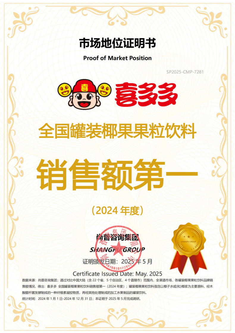 2025年5月,尚普咨询集团向喜多多集团有限公司颁发【喜多多 全国罐装椰果果粒饮料销售额第一(2024年度)】市场地位声明书。此项声明标志着喜多多在我国罐装椰果果粒饮料行业中的优势地位及市场的高度认可。