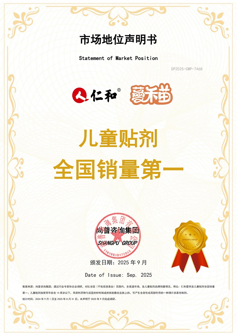 2025年9月,尚普咨询集团向仁和薆禾苗颁发【儿童贴剂全国销量第一】市场地位声明书。这份声明,不仅是对商业成就的权威背书,更是对一场“儿童健康护理革新”的见证——在仍以口服药剂为主流的市场中,仁和薆禾苗以科技之力,引领千万家庭选择更温和、更便捷的守护方式。