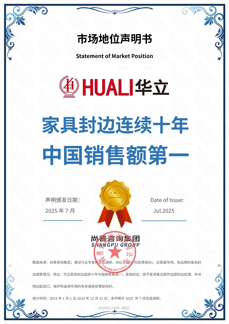 2025年7月,尚普咨询集团向东莞市华立实业股份有限公司(以下简称“华立股份”)旗下华立品牌的家具封边系列产品颁发市场地位声明书。此次华立家具封边系列产品荣获尚普咨询集团【家具封边连续十年中国销售额第一】权威声明,表明华立家具封边系列产品凭借其卓越品质和创新技术,赢得了市场的广泛认可。