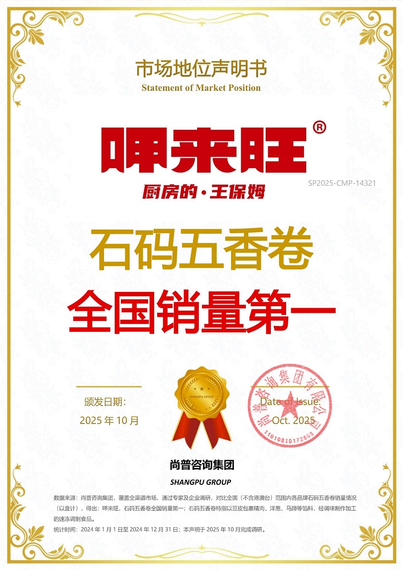 近期,经过严密的数据考证,尚普咨询集团向龙海市澄福食品有限公司旗下呷来旺品牌颁发权威市场地位声明,并确认授予重磅市场地位声明书:【呷来旺,石码五香卷全国销量第一】,这一系列声明不仅印证了呷来旺在速冻食品石码五香卷赛道的领先地位,更彰显了其的品牌实力、品质保障的执着追求以及卓越的市场表现。