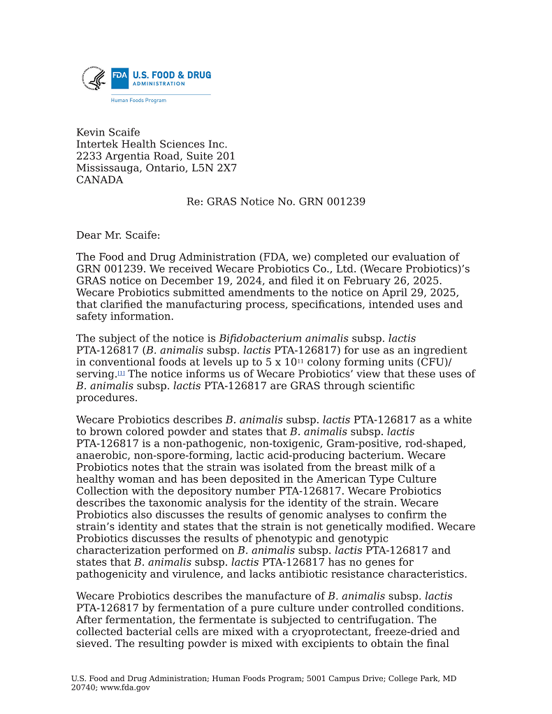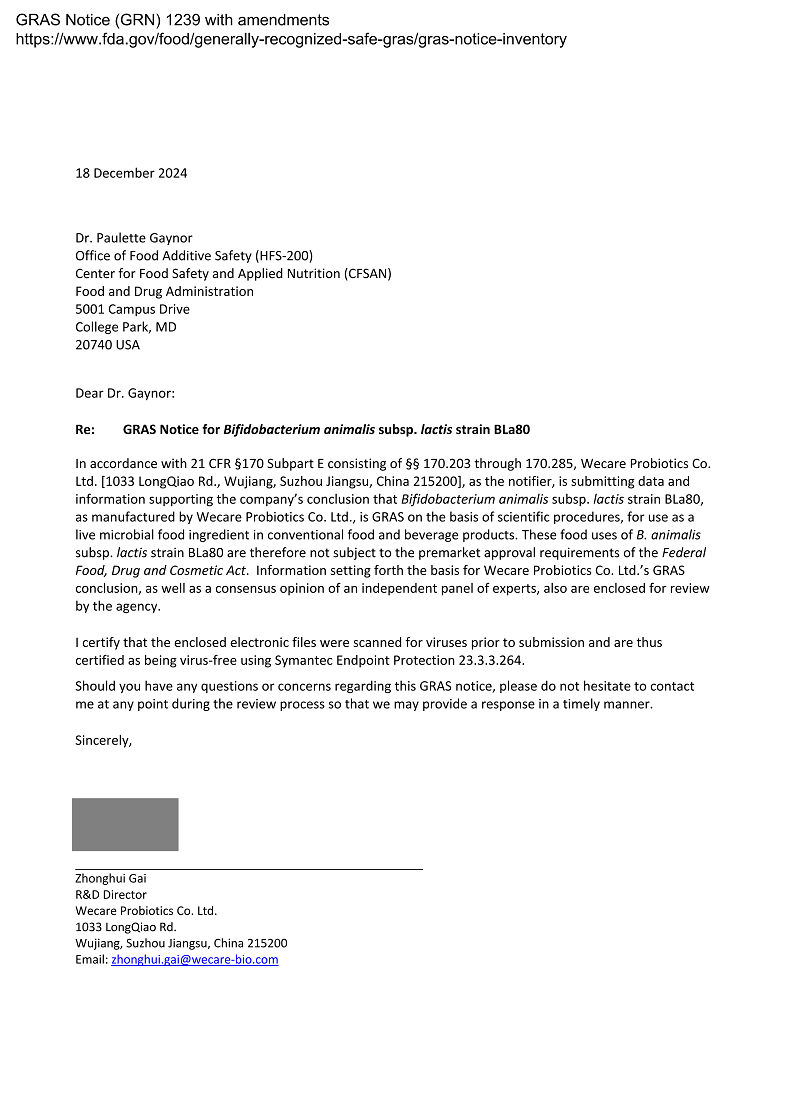 此外,动物双歧杆菌乳亚种BLa80还获得双GRAS认证,双GRAS认证是指美国食品药品监督管理局(FDA)对对食品添加剂安全性的评价标准,即GRAS自我声明(Self-Affirmed GRAS)和FDA GRAS认证(FDA GRAS Notice),这代表着其安全性和功效性获得国际权威认可。