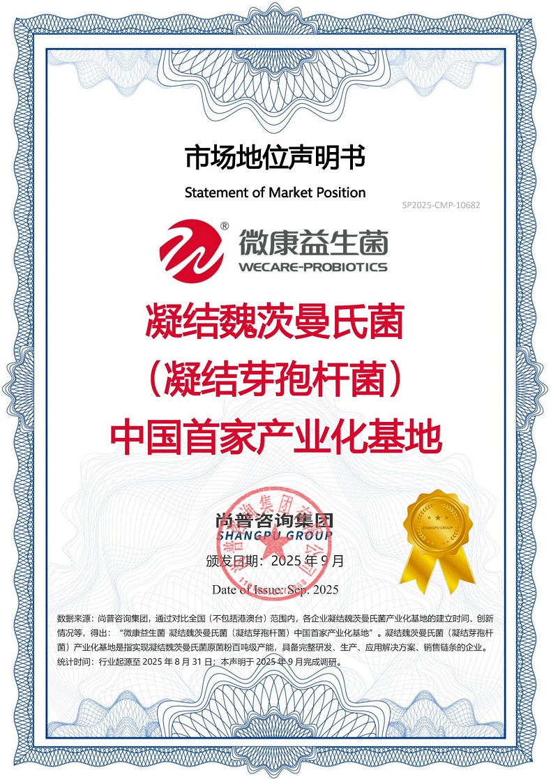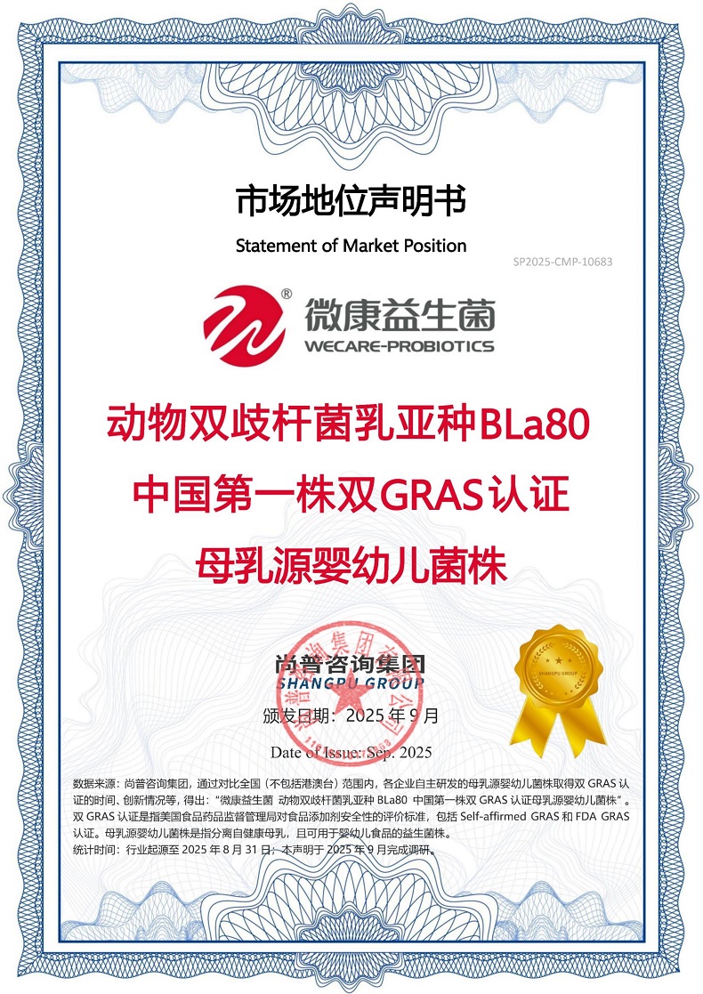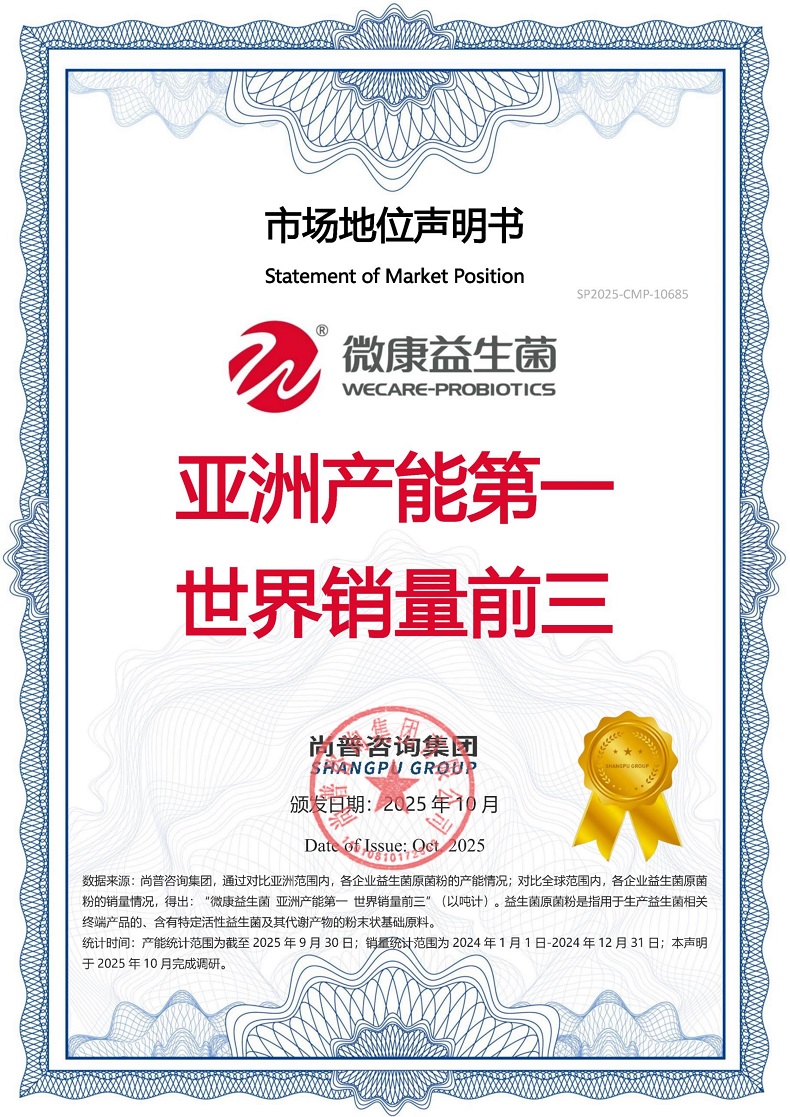 2025年,尚普咨询集团为微康益生菌颁发市场地位声明书。此次微康益生菌荣获尚普咨询【微康益生菌 亚洲益生菌原料企业全球销量第一】【微康益生菌 动物双歧杆菌乳亚种BLa80 中国第一株双GRAS认证母乳源婴幼儿菌株】【微康益生菌 动物双歧杆菌乳亚种BLa80中国大陆第一株婴幼儿名单菌株】【微康益生菌 凝结魏茨曼氏菌(凝结芽孢杆菌)中国首家产业化基地】【微康益生菌 亚洲产能第一 世界销量前三】市场地位声明,标志着微康益生菌在益生菌原料领域中的创新地位及市场影响力的高度认可。