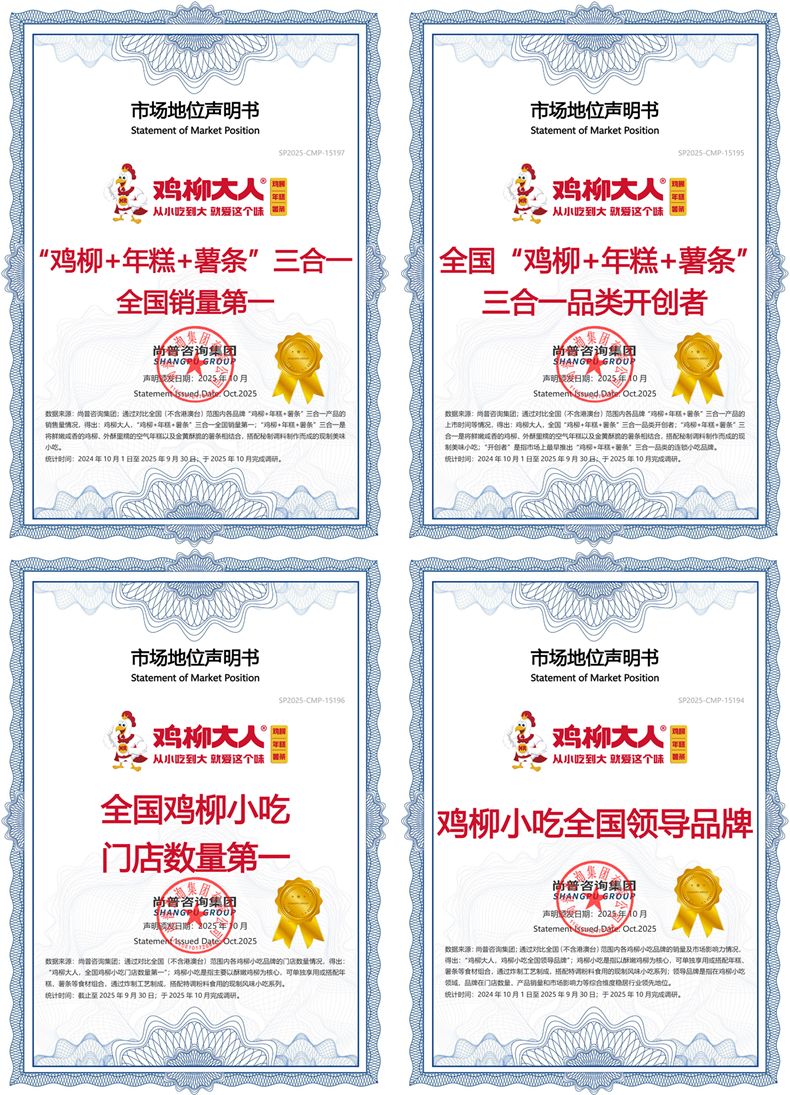 2025年10月,尚普咨询集团正式授予杭州激流大任餐饮管理有限公司旗下品牌“鸡柳大人” 【鸡柳大人,“鸡柳+年糕+薯条”三合一全国销量第一】、【鸡柳大人,全国“鸡柳+年糕+薯条”三合一品类开创者】、【鸡柳大人,全国鸡柳小吃门店数量第一】及【鸡柳大人,鸡柳小吃全国领导品牌】市场地位声明书。这一系列认证,不仅是对“鸡柳大人”独特创新商业模式和卓越产品品质的权威认可,更是对其在鸡柳小吃领域深耕多年、引领行业发展潮流的卓越成就的高度肯定。