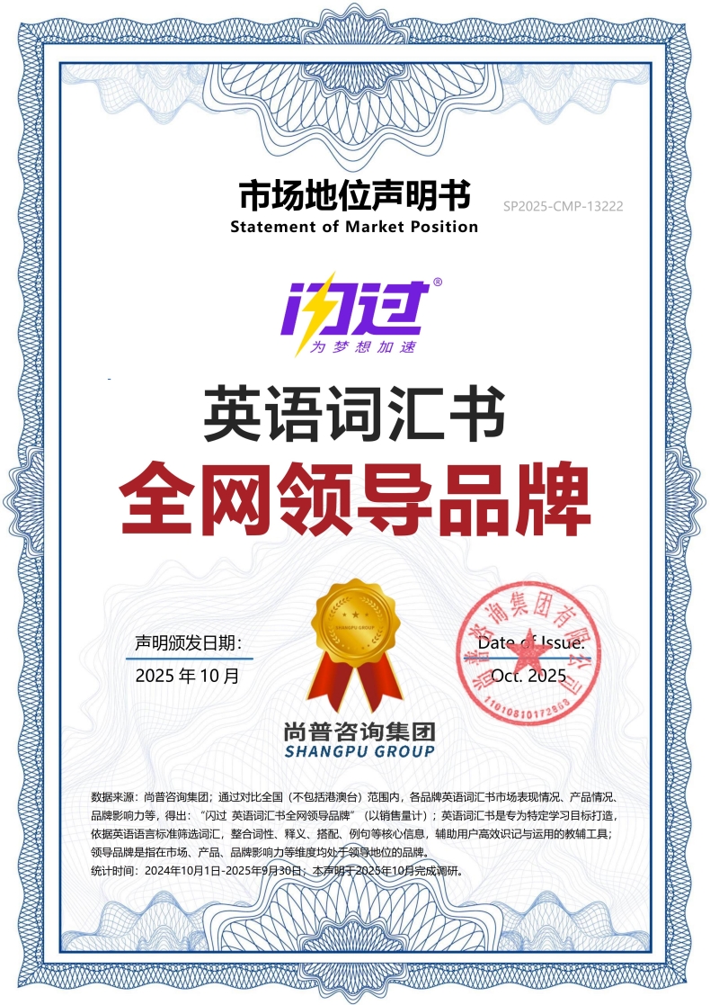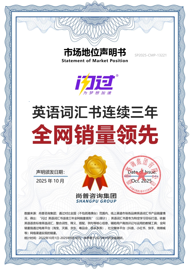 2025年10月,尚普咨询集团对英语词汇书市场开展了专项研究,从行业趋势、竞争格局、企业经营等方面进行了全面、系统且深入的调研。经过严密的数据考证,尚普咨询集团向陕西巨微图书文化传播有限公司(以下简称“巨微文化”)旗下“闪过”品牌颁发重磅市场地位声明书:【闪过英语词汇书全网领导品牌】【闪过英语词汇书连续三年全网销量领先】。这两项声明不仅彰显了“闪过”品牌在英语词汇教辅领域的市场领先地位,更印证了其深受用户信赖与青睐的卓越口碑。