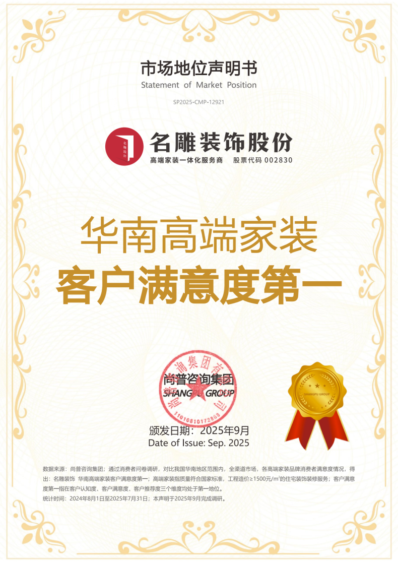 2025年9月,尚普咨询集团向名雕装饰颁发市场地位声明书。名雕装饰荣获【名雕装饰 中国高端家装领导品牌】【名雕装饰 华南高端家装客户满意度第一】两项市场地位声明,标志着其在家装行业的标杆地位及市场的高度认可。