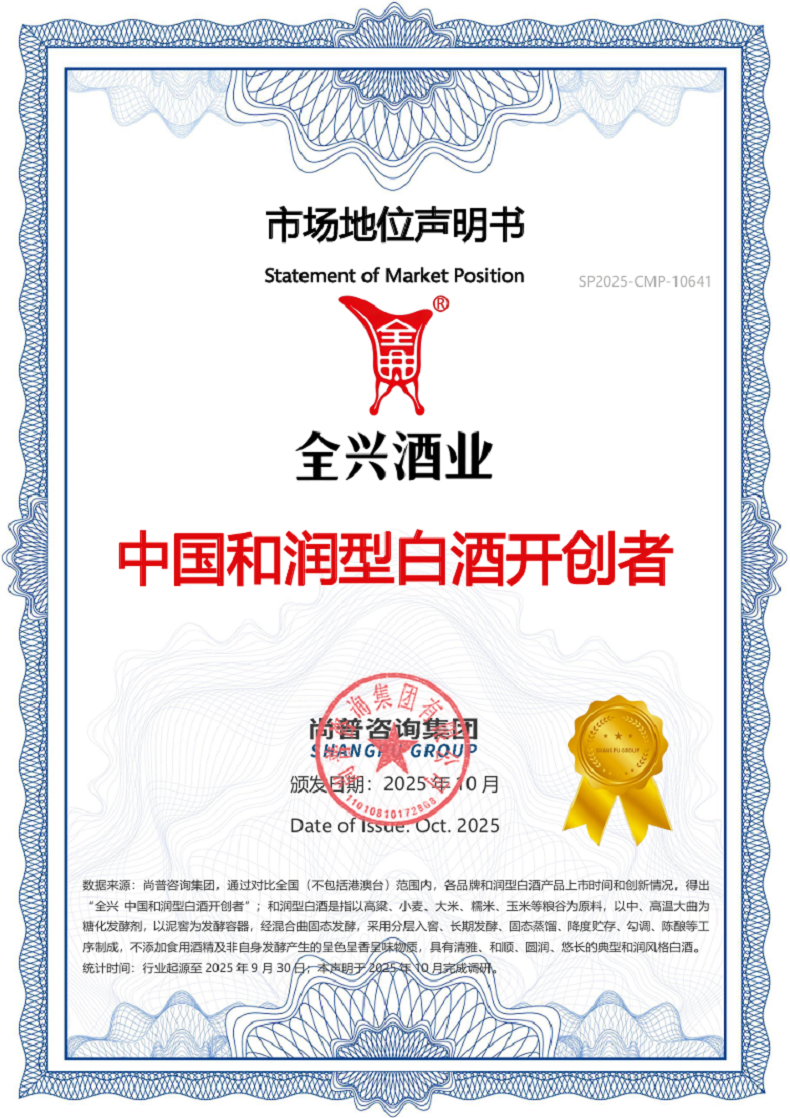 此次全兴荣获尚普咨询“中国和润型白酒开创者”市场地位声明,标志着全兴在行业中的领先地位,反映了其深受广大消费者认可与喜爱。