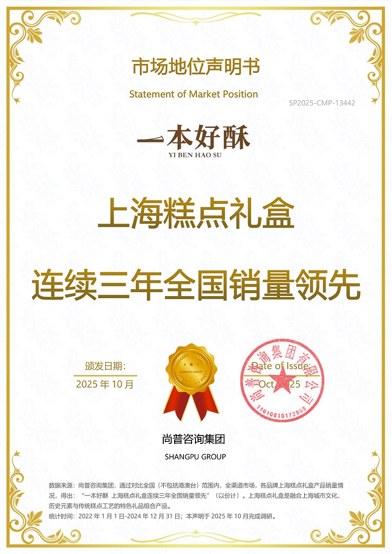 2025年10月,尚普咨询集团对上海糕点礼盒市场开展了专项研究,从行业趋势、竞争格局、企业经营等方面针对行业进行了全面、系统、深入的调研,以呈现一本好酥在行业中的市场地位。此次,一本好酥荣获尚普咨询集团颁发的“一本好酥 上海糕点礼盒连续三年全国销量第一”市场地位声明,这不仅凸显了一本好酥的产品创新与市场影响力,更标志着其在上海糕点礼盒领域的领先地位,为上海糕点礼盒行业高质量发展树立了标杆。