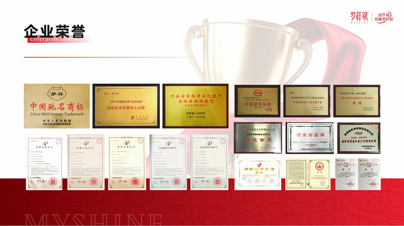 河南梦祥纯银制品有限公司始创于1993年,是一家以白银文化产业为核心,集珠宝首饰设计研发、生产加工、批发零售及文化传承于一体的综合性企业,凭借其30余年的产业深耕、卓越匠人精神的坚守、非遗技艺与技术创新的深度融合及线上线下销售模式的拓展,形成了以非遗文化为内核,以东方美学为设计语言,以"情感载体"为产品本质,接轨世界先进技术的设计生产理念,已成为银制品产业的领导品牌。