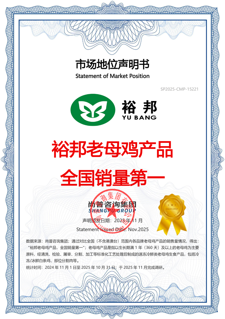 2025年11月,尚普咨询集团向当阳裕邦食品有限公司(以下简称:裕邦)颁发【裕邦老母鸡产品,全国销量第一】的市场地位声明书。此次裕邦荣获尚普咨询集团颁发的市场地位声明书,不仅是对裕邦老母鸡生食产品市场表现的充分肯定,更是对其在老母鸡生食产品行业中领先地位的高度认可。裕邦能够取得如此佳绩,其背后是自建标准化生态养殖基地的源头把控、全链条冷链保鲜技术的持续迭代、国家权威检疫标准的严格执行、集团二十余年深耕细分市场的品牌沉淀等共同筑成的竞争护城河。