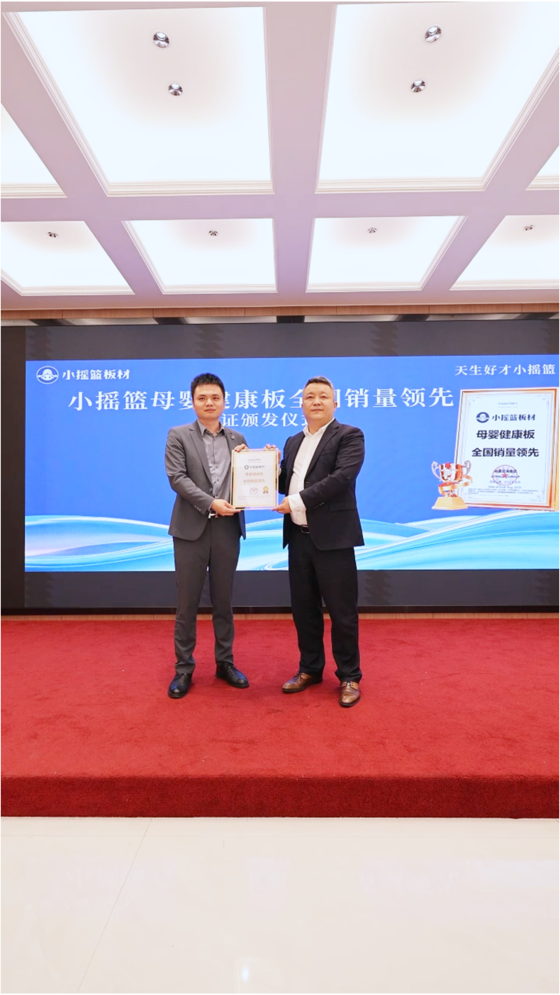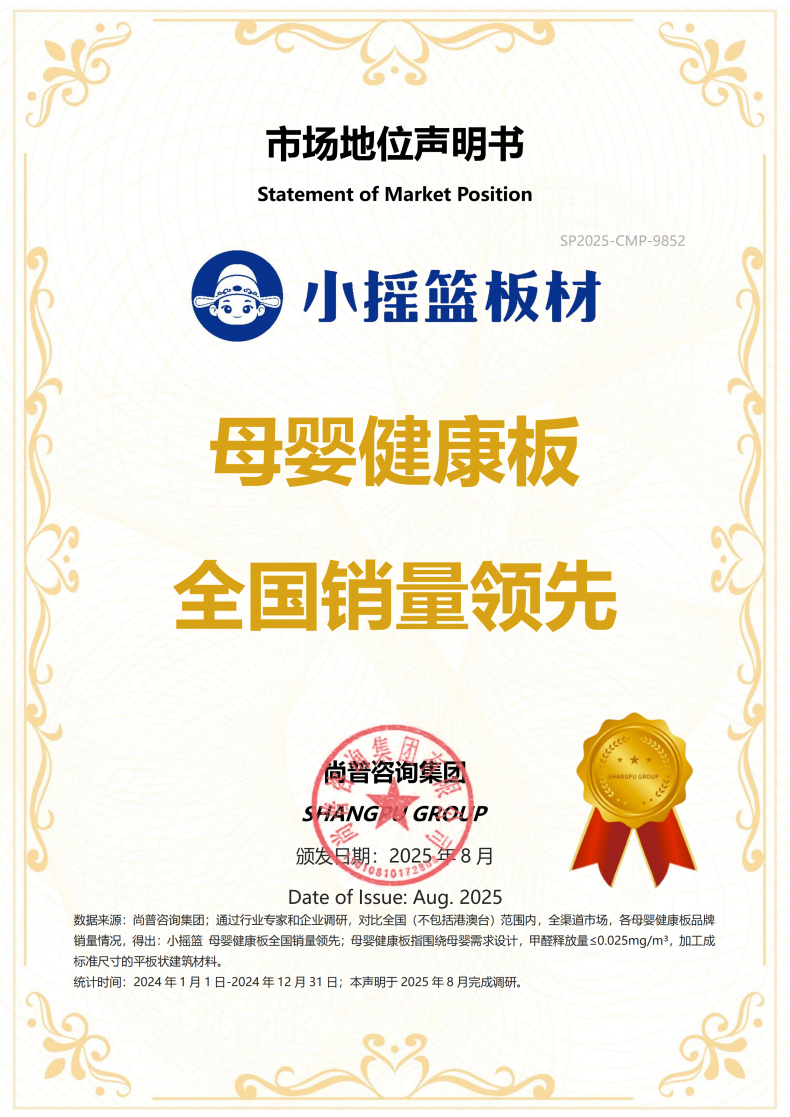 2025年8月,尚普咨询集团向小摇篮颁发市场地位声明书。小摇篮荣获【小摇篮 母婴概念板开创者】【小摇篮 母婴概念实木板全国销量第一】【小摇篮 母婴健康板全国销量领先】三项市场地位声明,标志着其在板材行业的标杆地位及消费者的高度信赖。