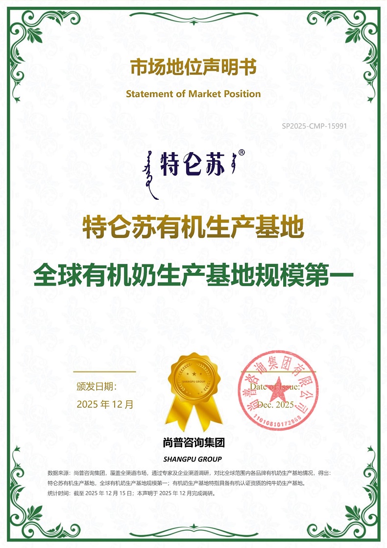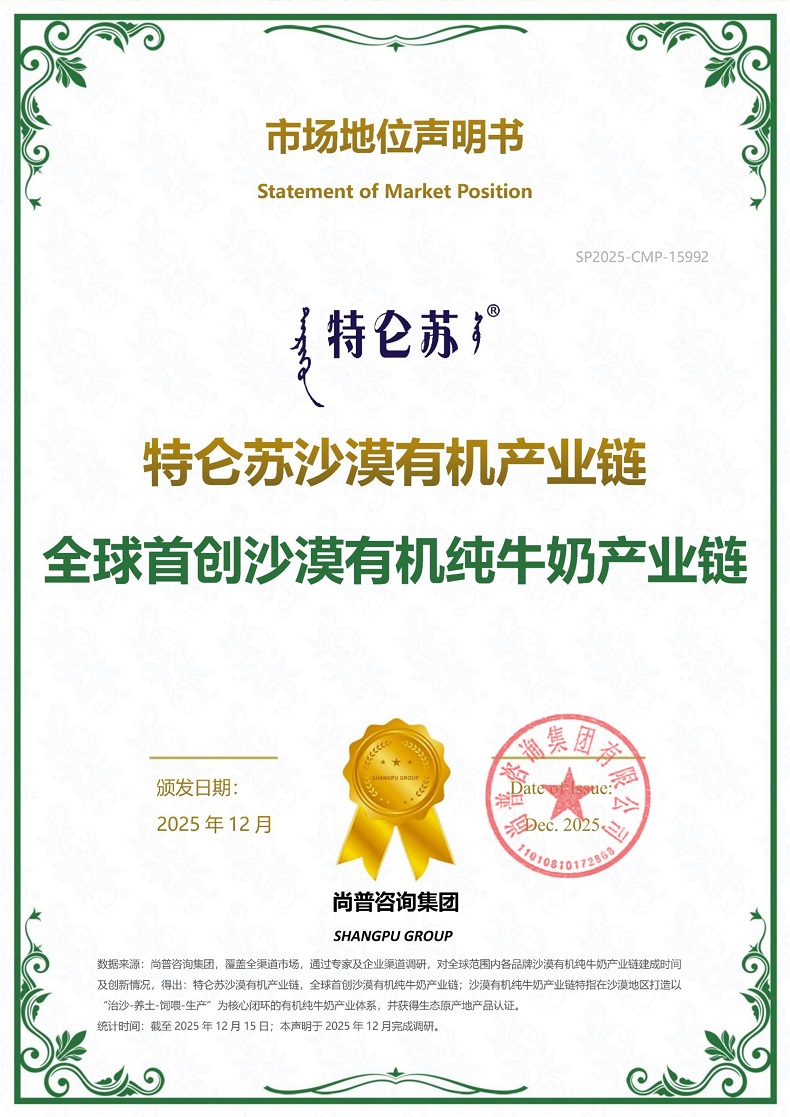 近期,尚普咨询集团向内蒙古蒙牛乳业(集团)股份有限公司(以下简称“蒙牛”)旗下特仑苏品牌颁发权威市场地位声明。此次,经过严密的数据考证,尚普咨询集团确认向特仑苏授予重磅市场地位声明书:“特仑苏沙漠有机产业链,全球首创沙漠有机纯牛奶产业链”和“特仑苏有机生产基地,全球有机奶生产基地规模第一”。这一声明印证了蒙牛特仑苏在有机纯牛奶市场的领先和创新地位。