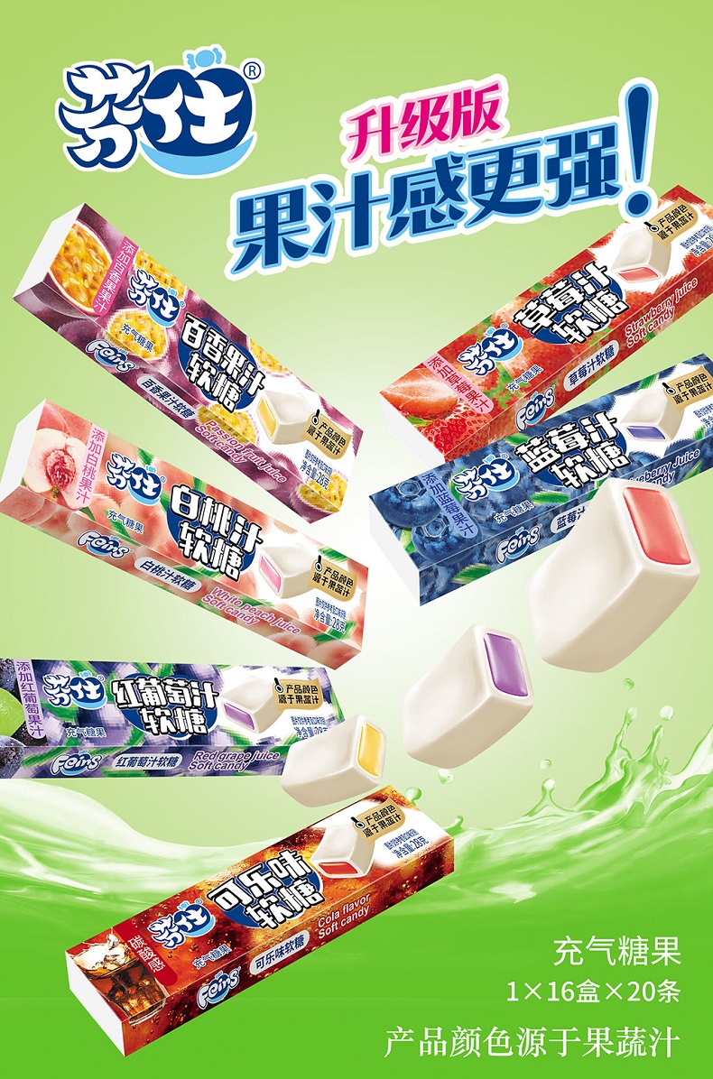 芬仕品牌旗下的果汁软糖产品有可乐、红葡萄汁、百香果汁、白桃汁、蓝莓汁等多种口味。其中,百香果汁软糖采用先进工艺将浓郁果香与软糖完美融合,口感细腻爽滑,且不添加人工色素,以天然成分还原鲜果本味,能够为消费者带来健康又美味的食用体验。