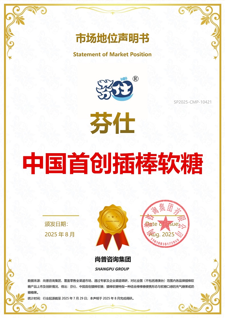 近期,尚普咨询集团向芬仕食品(广东)有限公司(以下简称“芬仕”) 旗下品牌芬仕颁发权威市场地位声明。此次,经过严密的数据考证,尚普咨询集团确认向芬仕授予重磅市场地位声明书【芬仕,28克条装果汁软糖全国销量第一】【芬仕,中国首创插棒软糖】。这一系列声明印证了芬仕的竞争力地位。
