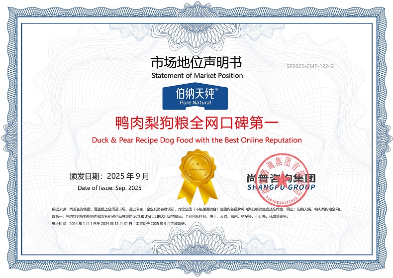 近期,尚普咨询集团向上海依蕴宠物用品有限公司旗下品牌伯纳天纯颁发权威市场地位声明。此次,经过严密的数据考证,尚普咨询集团确认向伯纳天纯授予重磅市场地位声明书:伯纳天纯,中国高肉膨化粮开创者;伯纳天纯,鸭肉梨狗粮全网口碑第一。这一系列声明印证了伯纳天纯的竞争力地位。