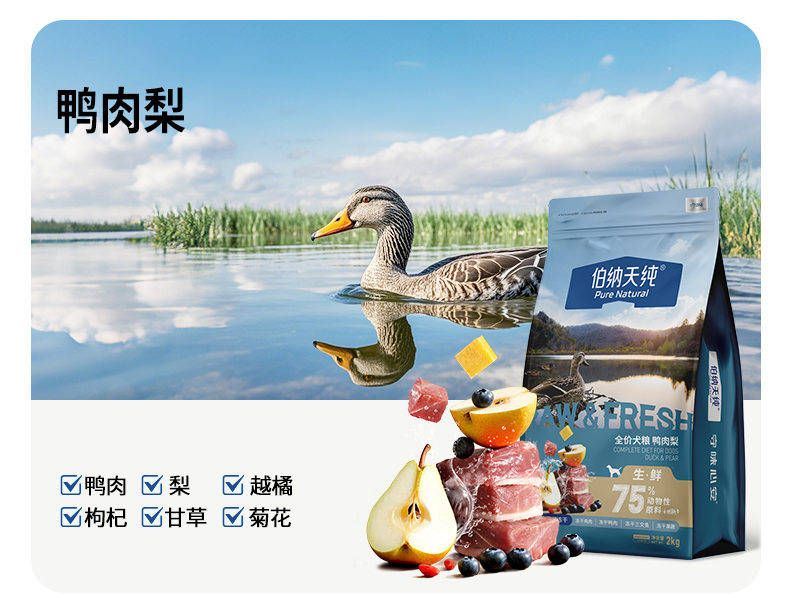 此外,伯纳天纯鸭肉梨狗粮产品包括生鲜系列鸭肉梨犬粮、舒纯鸭肉梨配方全价犬粮、舒纯鸭肉梨配方冻干双拼全价犬粮等产品。伯纳天纯生鲜系列鸭肉梨,75%高动物性原料占比,天生更爱吃,20多种缤纷食材营养更全面。鸭肉肉质鲜嫩且性凉清热;梨则包含多种维生素,润燥效果突出,二者组成“泪痕管理黄金搭档”。同时富含5%的四拼冻干锁住纯肉营养,果蔬补充维多维营养,这种“ 鸭肉+梨”的组合,能有效改善并缓解泪痕问题。