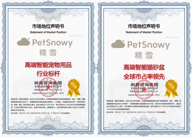 近日,国内权威市场研究机构尚普咨询集团通过严谨调研与论证,正式授予高端智能宠物品牌“糯雪PetSnowy”“高端智能宠物用品行业标杆”及“高端智能猫砂盆全球市占率领先”两项市场地位声明。这不仅是对糯雪市场地位的官方认可,更是对其以技术创新驱动全球增长模式的充分肯定,标志着糯雪在市场份额、品牌影响力及技术研发等多个维度已建立起突出优势。