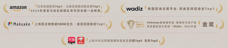 真正的行业标杆地位,必须经得起全球市场的检验。早在2023年,糯雪首款SNOW智能猫砂盆在Indiegogo众筹平台上线,仅用60天就筹集近200万美元,打破宠物品类众筹历史纪录,强势登顶年度榜单。随后,糯雪迅速拓展至亚马逊、独立站等全球主流电商渠道,在多个成熟市场,其智能猫砂盆产品销量稳居品类前列。2023年,SNOW智能猫砂盆与智能饮水机更是一举夺得美国MUSE缪斯设计奖,进一步印证了其在产品创新与用户体验设计上的国际竞争力。